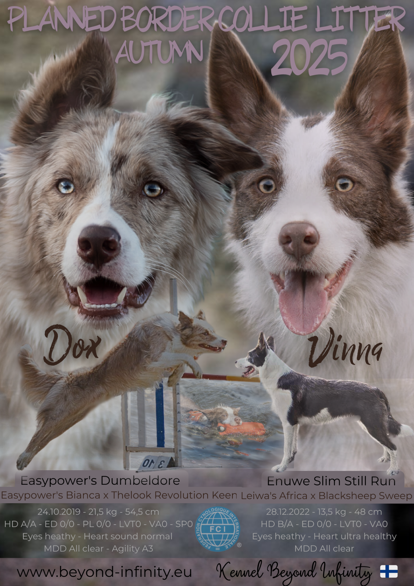 Dox has genetic diversity 37, so average to border collies. In this combination I expect puppies to have higher diversity than Dox has as they have inbreeding % 0,01 with Vinna im 8 generation - only one same dog in the pedigree: 7th generation in Dox's and 8th generation in Vinna's pedigree. Dox has a known genetic risk for OCD and that is the biggest health risks for me with this litter. Yet I think the genetic diversity gives great base to not having so much genetic deseaces and also as OCD is from multiple causing where affecting also nutrition, load (especially too young too much) and bone scructure - front bone scructure especially. Both parents have very nice bone scructure and Vinna has excellent front. Because of that and also that Vinna has no known OCD in anywhere near and my risk evaluation, I believe this combo can also bring an OCD free litter.